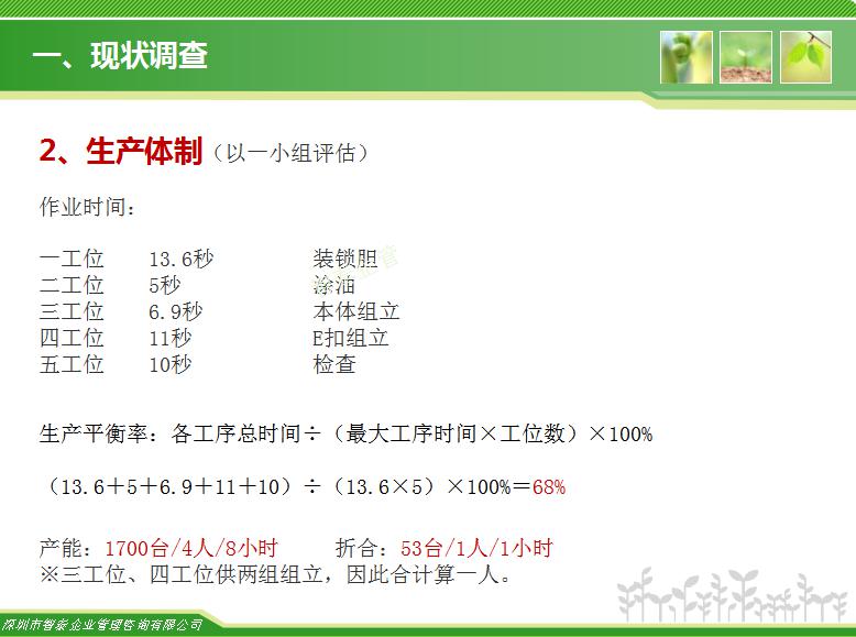 在精益生產(chǎn)中車間經(jīng)常要改進(jìn)的內(nèi)容是生產(chǎn)線上的生產(chǎn)平衡率問題,目前國(guó)內(nèi)加工型企業(yè)的生產(chǎn)平衡率只有65%左右,對(duì)于智泰專業(yè)團(tuán)隊(duì)來(lái)說(shuō),這里面的改善空間巨大,通過(guò)智泰人的努力,在企業(yè)推進(jìn)生產(chǎn)平衡率平均提升到85%以上,階段為生產(chǎn)效率提升案例,請(qǐng)查閱: