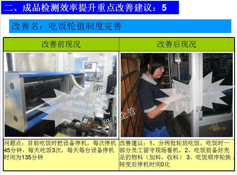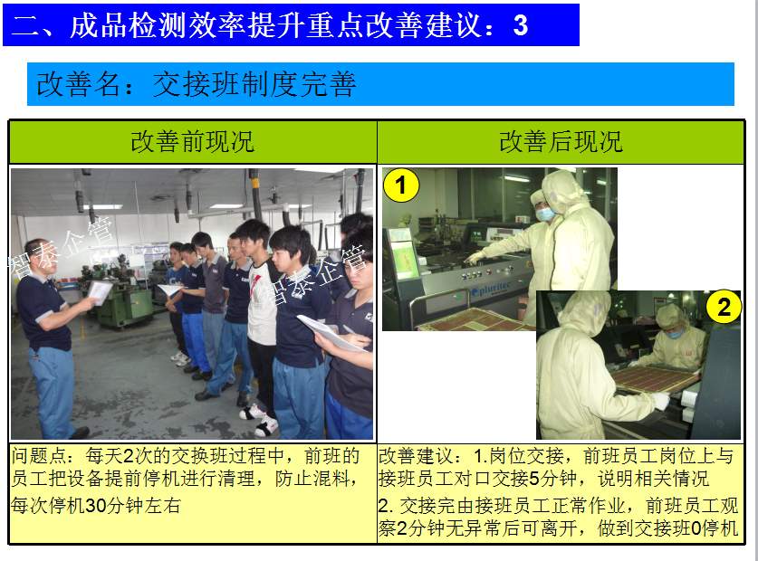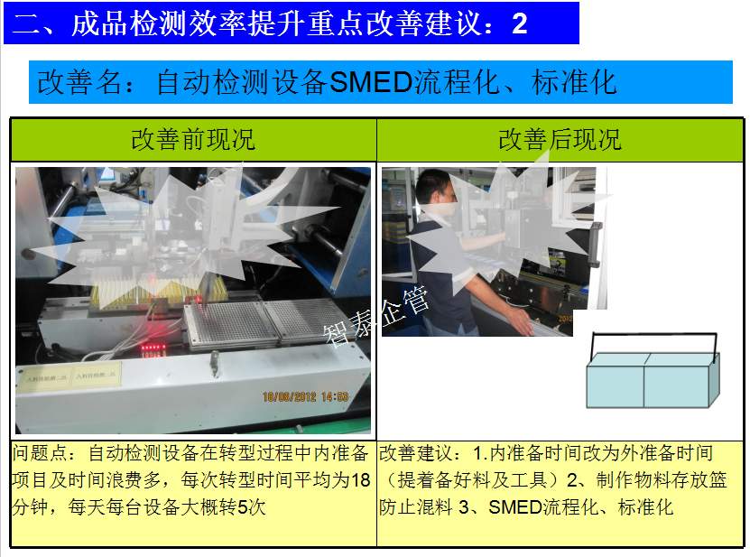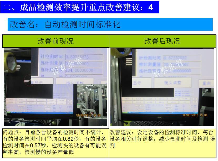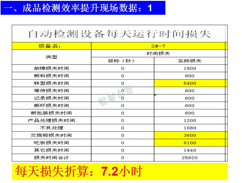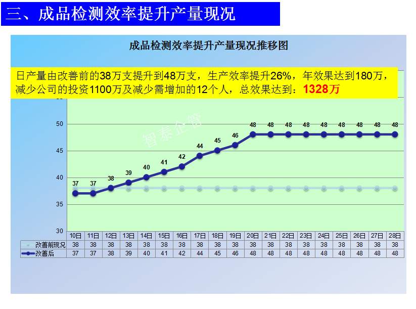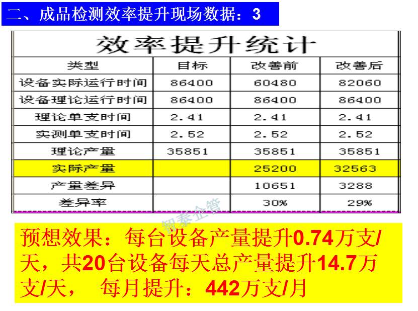 世界級制造及精益管理是智泰人一生追求的理想,智泰咨詢在企業(yè)推進(jìn)精益生產(chǎn)后平均生產(chǎn)效率提升35%以上,智泰專業(yè)團(tuán)隊(duì)為企業(yè)消除八大浪費(fèi),通過精益管理,提高企業(yè)的生產(chǎn)效率和產(chǎn)品質(zhì)量,持續(xù)推進(jìn)焦點(diǎn)課題改進(jìn)重大問題,每年給企業(yè)帶來的收益平均有800萬以上,附件為智泰咨詢顧問團(tuán)隊(duì)為某企業(yè)生產(chǎn)效率提升的案例,請查閱: