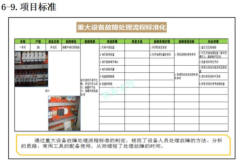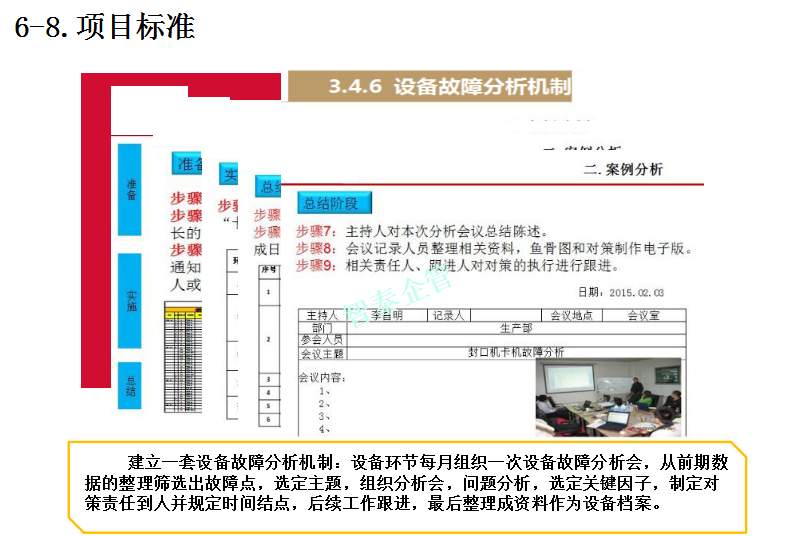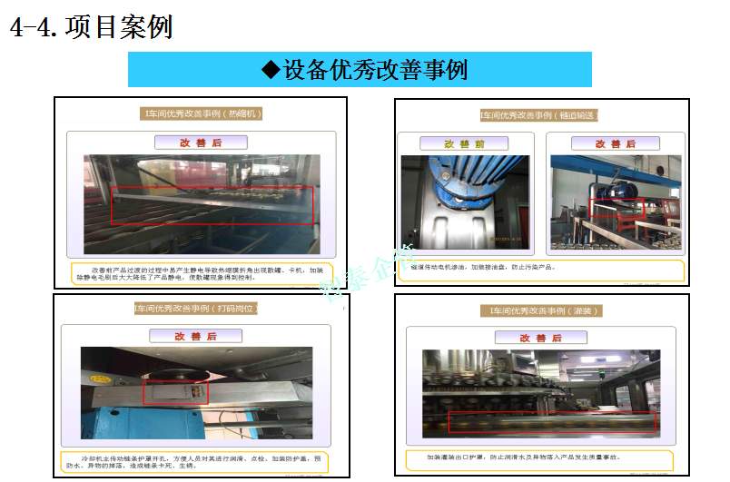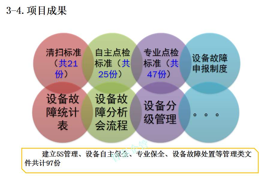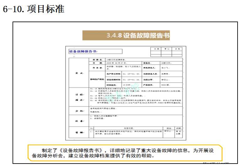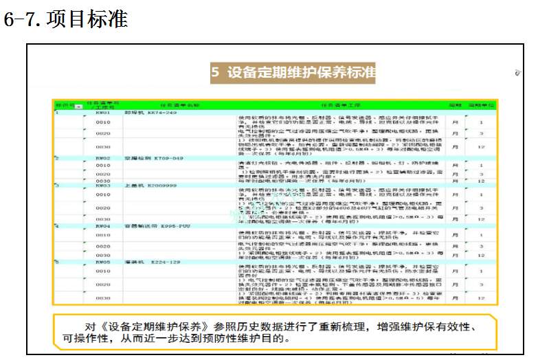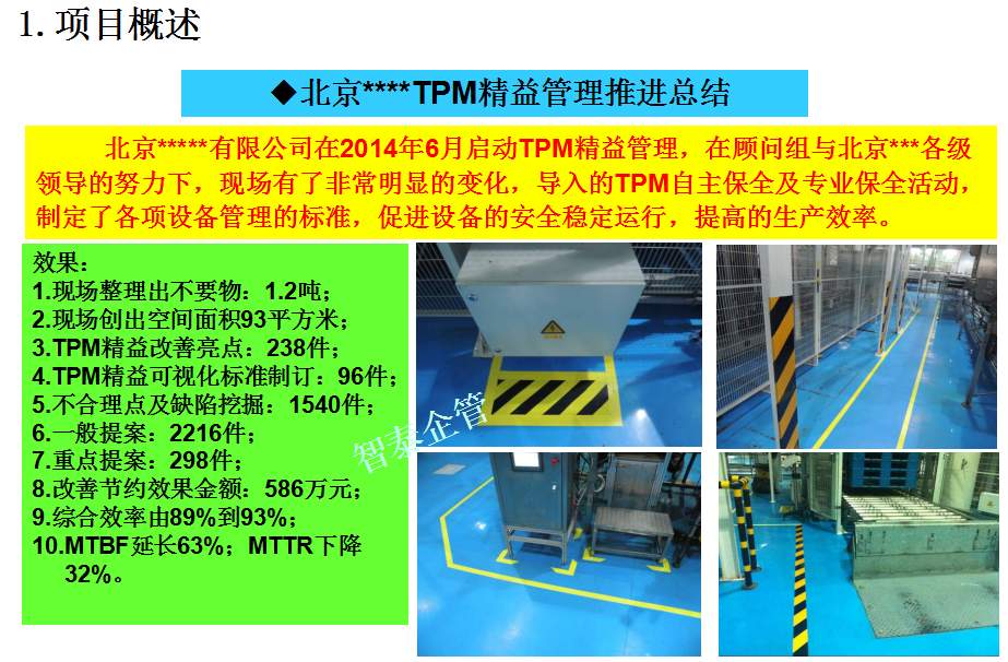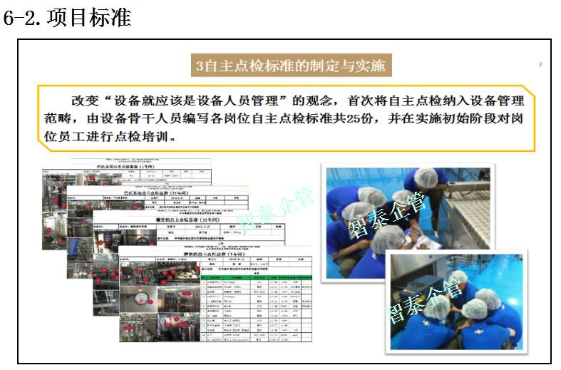 智泰咨詢下屬的TPM咨詢公司為企業(yè)推進(jìn)的TPM管理活動(dòng)中,為企業(yè)設(shè)備故障率下降推進(jìn)了大量的制度及標(biāo)準(zhǔn),通過TPM全員參與活動(dòng),消除設(shè)備的缺陷并改善及復(fù)原,并對(duì)設(shè)備進(jìn)行部分改良,促進(jìn)設(shè)備長(zhǎng)期穩(wěn)定運(yùn)行,提高設(shè)備生產(chǎn)綜合效率,附件為智泰咨詢專業(yè)團(tuán)隊(duì)在某企業(yè)推進(jìn)的TPM管理實(shí)錄,請(qǐng)查閱: