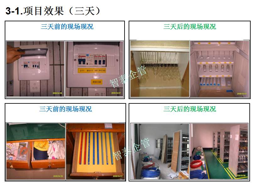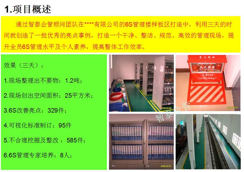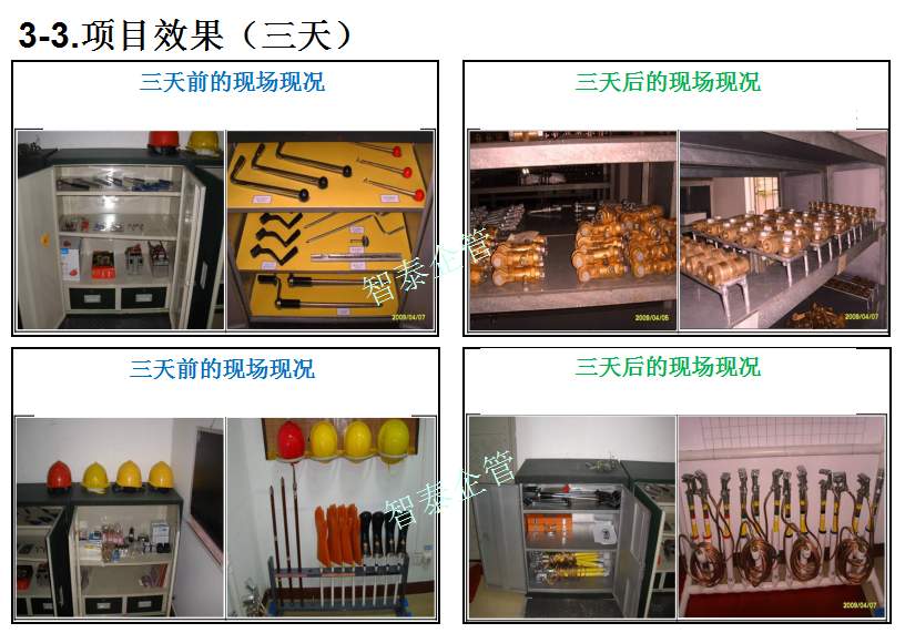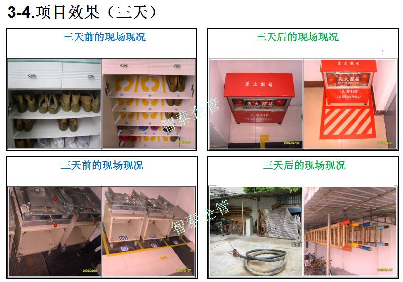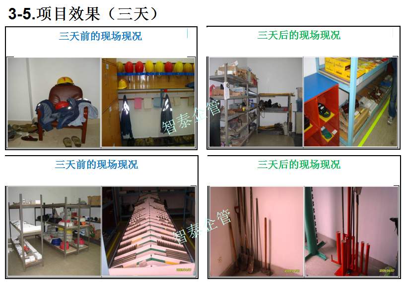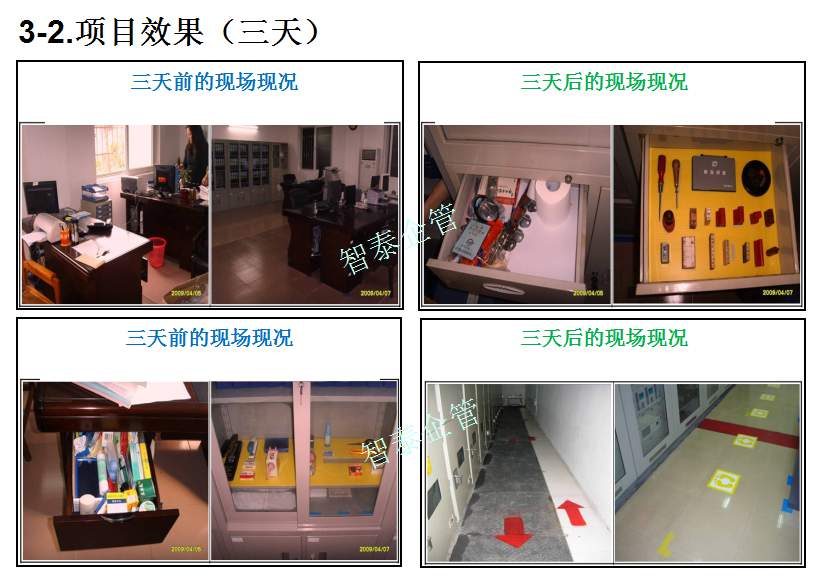智泰咨詢下屬的5S管理公司首創(chuàng)的產(chǎn)品三天一標(biāo)桿,三天一條線,三天締造6~8個標(biāo)桿車間,智泰咨詢專業(yè)的顧問團(tuán)隊(duì)為企業(yè)的5S管理快速打造已形成一套標(biāo)準(zhǔn)內(nèi)容,能夠快速在企業(yè)全面推進(jìn)5S管理,附件為智泰咨詢?yōu)槟称髽I(yè)快速打造5S管理樣板區(qū)三天前后對比的現(xiàn)況,請查閱: