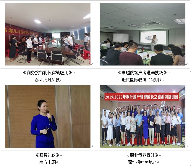 曾多次指導(dǎo)國際及國內(nèi)重要來訪的商務(wù)接待禮儀流程,及中國區(qū)中外籍員工的商務(wù)著裝、商務(wù)行為及商務(wù)溝通禮儀培訓(xùn),并固定每季度為員工進(jìn)行行為標(biāo)準(zhǔn)、著裝要求等培訓(xùn),幫助企業(yè)提高員工素質(zhì)、員工責(zé)任心和忠誠度,營造一個尊重企業(yè)、尊重他人、尊重自我的企業(yè)環(huán)境,獲得企業(yè)領(lǐng)導(dǎo)及員工高度認(rèn)可,榮獲“優(yōu)秀之星”獎。