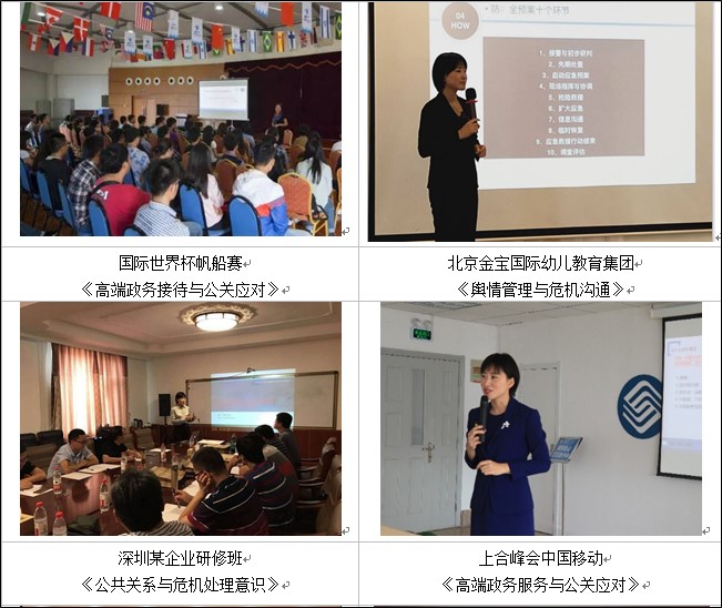 石慧老師擁有15年高級管理及企業(yè)公關(guān)管理工作經(jīng)驗,曾任職于世界500強企業(yè)擔(dān)任企業(yè)公關(guān)負責(zé)人,長期專注于危機公關(guān)、危機管理、媒體事件、突發(fā)事件應(yīng)急管理、領(lǐng)導(dǎo)人的公眾形象和高端商務(wù)政務(wù)客戶服務(wù)的研究和實踐,具有豐富的危機公關(guān)、媒體傳播、服務(wù)營銷培訓(xùn)和實戰(zhàn)經(jīng)驗,石老師吸收國內(nèi)外危機公關(guān)與國際商務(wù)禮儀理念,形成最符合中國企業(yè)在危機公關(guān)的應(yīng)對策略,幫助公關(guān)人員在應(yīng)對危機時,更能得體有效的應(yīng)對危機、化解危機,讓企業(yè)的品牌影響力更為有效的發(fā)揮。學(xué)員們都說石老師是目前在危機公關(guān)領(lǐng)域中難得的即懂得危機公關(guān)處理,又懂得國際禮儀的雙項講師,被譽為:危機公關(guān)老師中最懂國際商務(wù)禮儀,國際商務(wù)禮儀老師中最懂危機公關(guān)的老師“石老師曾多次服務(wù)青島日報社、青島電視臺、青島人民廣播電臺、青島新聞網(wǎng)、《格調(diào)》高端雜志等國內(nèi)知名企業(yè)及媒體,足跡曾遍布國內(nèi)100余省、市,授課近500場次,學(xué)員近2萬人次,深受學(xué)員喜愛。