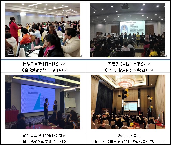 ★ 曾給尚赫天津保健用品有限公司員工講授《會(huì)議營(yíng)銷實(shí)戰(zhàn)技巧訓(xùn)練》、《顧問(wèn)式銷售邀約技巧》、《銷售贏在溝通》、《顧問(wèn)式絕對(duì)成交5步法則》等系列課程,協(xié)助企業(yè)完成精英團(tuán)隊(duì)的打造,培訓(xùn)過(guò)程采用項(xiàng)目方式,邊培訓(xùn),邊領(lǐng)導(dǎo)團(tuán)隊(duì)實(shí)施項(xiàng)目改善,經(jīng)過(guò)《會(huì)議營(yíng)銷實(shí)戰(zhàn)技巧訓(xùn)練》課程后,團(tuán)隊(duì)學(xué)以致用,在實(shí)際銷售實(shí)踐中,團(tuán)隊(duì)銷售翻翻。在此期間培訓(xùn)返聘率達(dá)到100%。