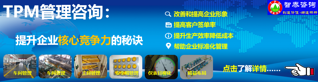 智泰咨詢機(jī)構(gòu)提供專業(yè)的5S管理,6S管理,TPM管理,精益生產(chǎn)管理的咨詢與培訓(xùn)服務(wù);我們有一批從事企業(yè)管理咨詢20年以上的資深顧問,他們行業(yè)經(jīng)驗(yàn)豐富,成功案例多,是真正落地的咨詢機(jī)構(gòu)!