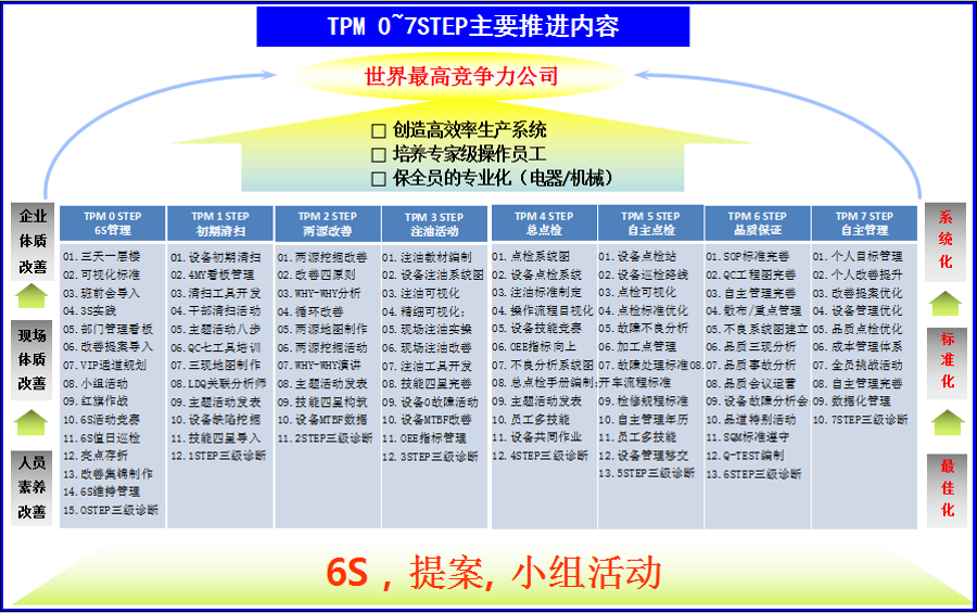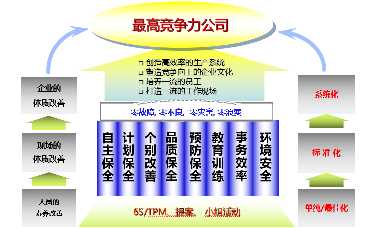 通過不斷循環(huán)的TPM八大支柱活動,持續(xù)的全員參與6S/TPM,提案和小組活動,把企業(yè)人員的素養(yǎng)提升到最佳化,把現(xiàn)場的體質(zhì)改善后要成為標(biāo)準(zhǔn)化持續(xù)管理,對企業(yè)的運(yùn)營形成制度化和系統(tǒng)化,企業(yè)必定會成為行業(yè)最高競爭力的公司。