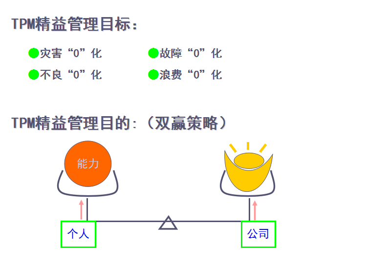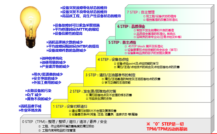 TPM 7 STEP是自主管理:通過持續(xù)的TPM各STEP的活動,員工綜合素養(yǎng)和能力達(dá)到最佳化,前期標(biāo)準(zhǔn)化內(nèi)容形成企業(yè)管理的制度,優(yōu)化各項(xiàng)管理的流程,確保成為行業(yè)最高競爭力的公司。