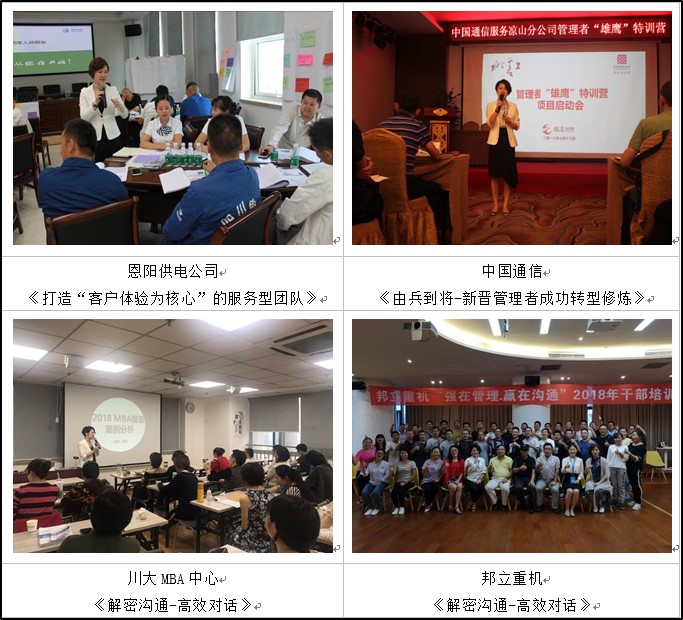 為通訊行業(yè)培養(yǎng)1000余名優(yōu)質(zhì)員工及管理者:多次應(yīng)邀為四川移動、成都移動、四川電信、成都電信、四川通信服務(wù)公司、涼山通信服務(wù)公司等進(jìn)行《習(xí)贏職場-高效能人士的七把金鑰匙》、《由兵到將-新晉管理者成功轉(zhuǎn)型修煉》、《新員工職業(yè)化和服務(wù)營銷》等課程培訓(xùn),為通訊行業(yè)培養(yǎng)1000余名優(yōu)質(zhì)員工及管理者,客戶滿意度達(dá)94%以上。