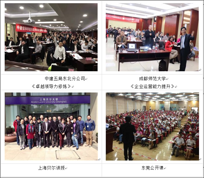 高校與政府機(jī)構(gòu):山西電力黨校、深圳清華大學(xué)研究院、清華大學(xué)PE總裁班、中山大學(xué)(MBA)廣州研究院、中山大學(xué)(MBA)江門(mén)研究院、西點(diǎn)執(zhí)行力學(xué)院、武漢大學(xué)經(jīng)管學(xué)院EDP、東莞黃岡貴族理想學(xué)校、深圳市學(xué)知文化、南昌財(cái)經(jīng)大學(xué)、上海交通大學(xué)、蘇州大學(xué)、新疆財(cái)經(jīng)大學(xué)、涼山州國(guó)資委……