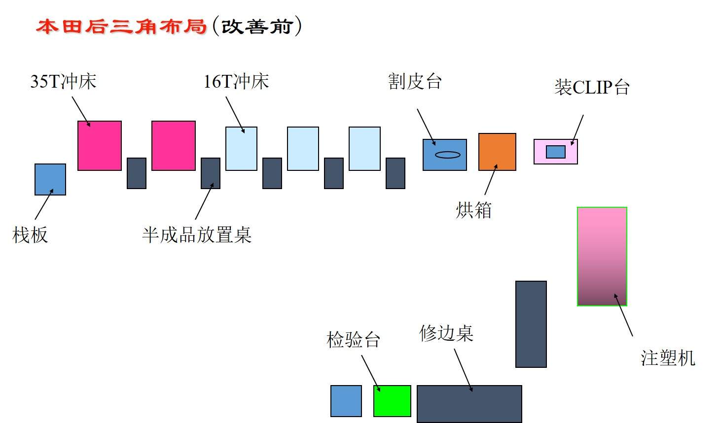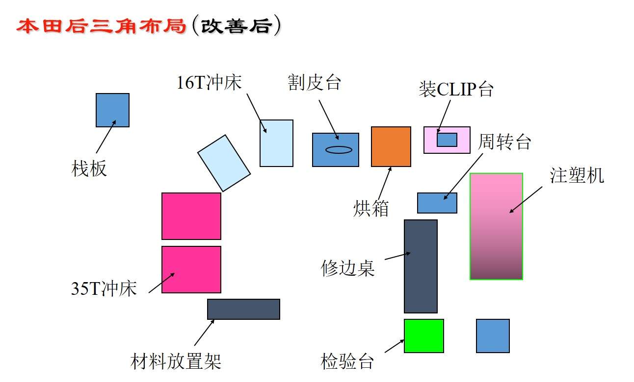 在一些工廠中經(jīng)??梢钥吹剑煌ば虻募庸ぴO(shè)備之間的距離非常遠(yuǎn),搬運到下一道工序,這樣的現(xiàn)象被稱為孤島設(shè)備。“一個流”生產(chǎn)要求放棄按設(shè)備類型排列的布局,而是按照加工順序來排列生產(chǎn)設(shè)備,避免孤島設(shè)備現(xiàn)象的出現(xiàn),盡可能使設(shè)備的布置流水線化,真正做到只有“一個流”。