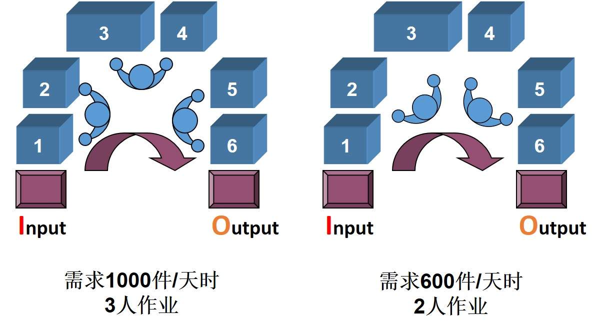 在傳統(tǒng)生產(chǎn)方式中,工人通常只會操作一種設(shè)備。當(dāng)A設(shè)備的生產(chǎn)能力很強(qiáng)而B設(shè)備的生產(chǎn)能力較弱時,很容易造成A設(shè)備的操作工人空閑而B設(shè)備的操作工人過于繁忙,從而導(dǎo)致生產(chǎn)不均衡。因此,“一個流”生產(chǎn)要求工人能夠操作多臺生產(chǎn)設(shè)備,通過培養(yǎng)多能工來均衡整個生產(chǎn)節(jié)拍。此外,培養(yǎng)多能工還有利于人員的增加或減少。
