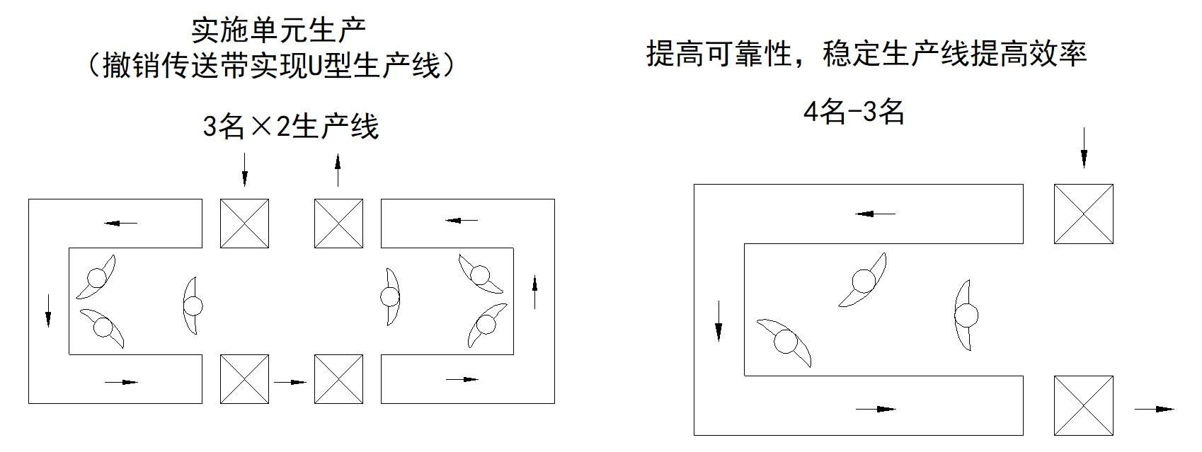 如果將生產(chǎn)設(shè)備一字?jǐn)[開,工人從第一臺設(shè)備到最后一臺設(shè)備就需要走動很遠(yuǎn)的距離,從而造成嚴(yán)重的人力浪費。因此,“一個流”生產(chǎn)要求將生產(chǎn)設(shè)備按照“U”字型來排列,從入口到出口形成一個完整的“U”型,這樣就可以大量的減少由于不同工序之間的傳遞而造成的走動,減少時間和搬運的浪費,增加生產(chǎn)效率。